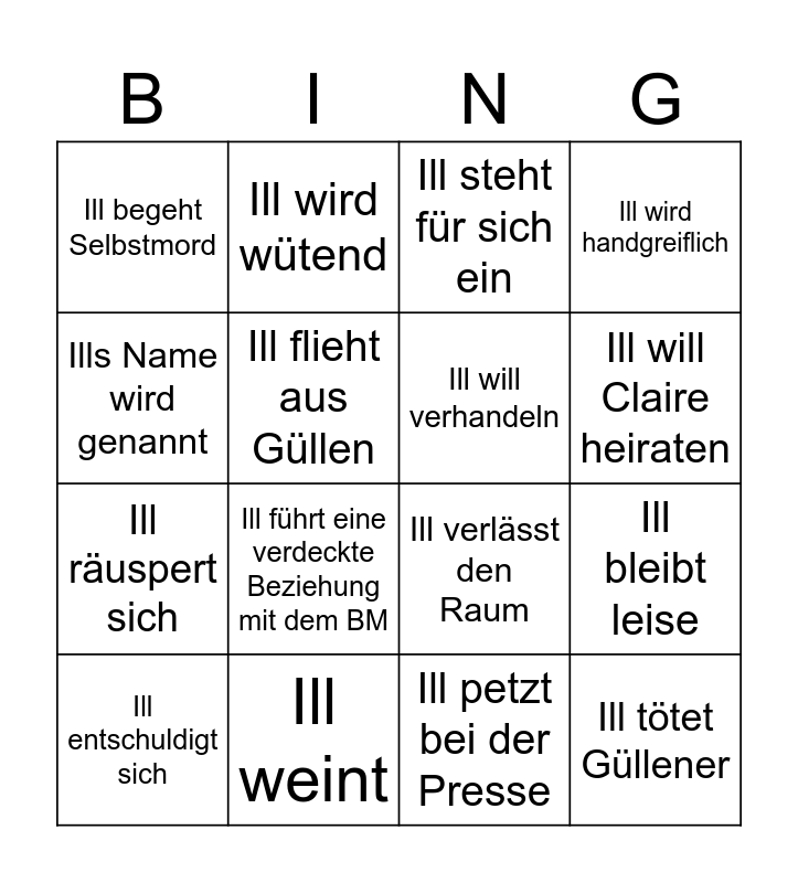 This bingo card has 16 words: Ill weint, Ill bleibt leise, Ill steht für sich ein, Ill begeht Selbstmord, Ill räuspert sich, Ill wird wütend, Ill verlässt den Raum, Ill petzt bei der Presse, Ills Name wird genannt, Ill flieht aus Güllen, Ill entschuldigt sich, Ill wird handgreiflich, Ill führt eine verdeckte Beziehung mit dem BM, Ill will Claire heiraten, Ill will verhandeln and Ill tötet Güllener.