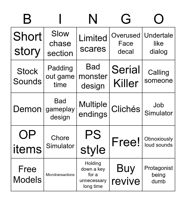 This bingo card has 25 words: Chore Simulator, Holding down a key for a unnecessary long time, Bad monster design, Free Models, Undertale like dialog, Short story, Stock Sounds, Slow chase section, Clichés, PS style, Serial Killer, Demon, Free!, Obnoxiously loud sounds, Padding out game time, Protagonist being dumb, Job Simulator, Limited scares, Calling someone, Bad gameplay design, Multiple endings, Microtransactions, OP items, Overused Face decal and Buy revive.