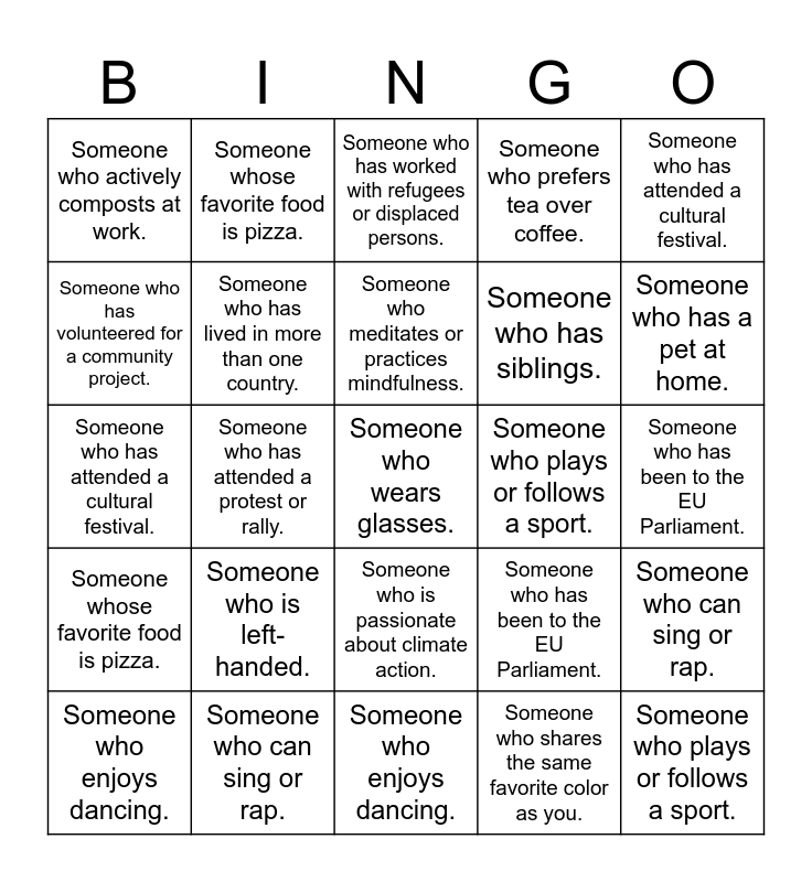 This bingo card has 46 words: Someone who has siblings., Someone who wears glasses., Someone who has a pet at home., Someone who enjoys dancing., Someone who is left-handed., Someone who is passionate about climate action., Someone whose favorite food is pizza., Someone who is an only child., Someone who has volunteered for a community project., Someone who plays a musical instrument., Someone who has lived in more than one country., Someone who prefers tea over coffee., Someone who can sing or rap., Someone who has been to the EU Parliament., Someone who has visited more than three continents., Someone who is afraid of spiders., Someone who meditates or practices mindfulness., Someone who plays or follows a sport., Someone who has worked with refugees or displaced persons., Someone who has attended a cultural festival., Someone who has attended a protest or rally., Someone who shares the same favorite color as you., Someone who actively composts at work., Someone who has siblings., Someone who wears glasses., Someone who has a pet at home., Someone who enjoys dancing., Someone who is left-handed., Someone who is passionate about climate action., Someone whose favorite food is pizza., Someone who is an only child., Someone who has volunteered for a community project., Someone who plays a musical instrument., Someone who has lived in more than one country., Someone who prefers tea over coffee., Someone who can sing or rap., Someone who has been to the EU Parliament., Someone who has visited more than three continents., Someone who is afraid of spiders., Someone who meditates or practices mindfulness., Someone who plays or follows a sport., Someone who has worked with refugees or displaced persons., Someone who has attended a cultural festival., Someone who has attended a protest or rally., Someone who shares the same favorite color as you. and Someone who actively composts at work..