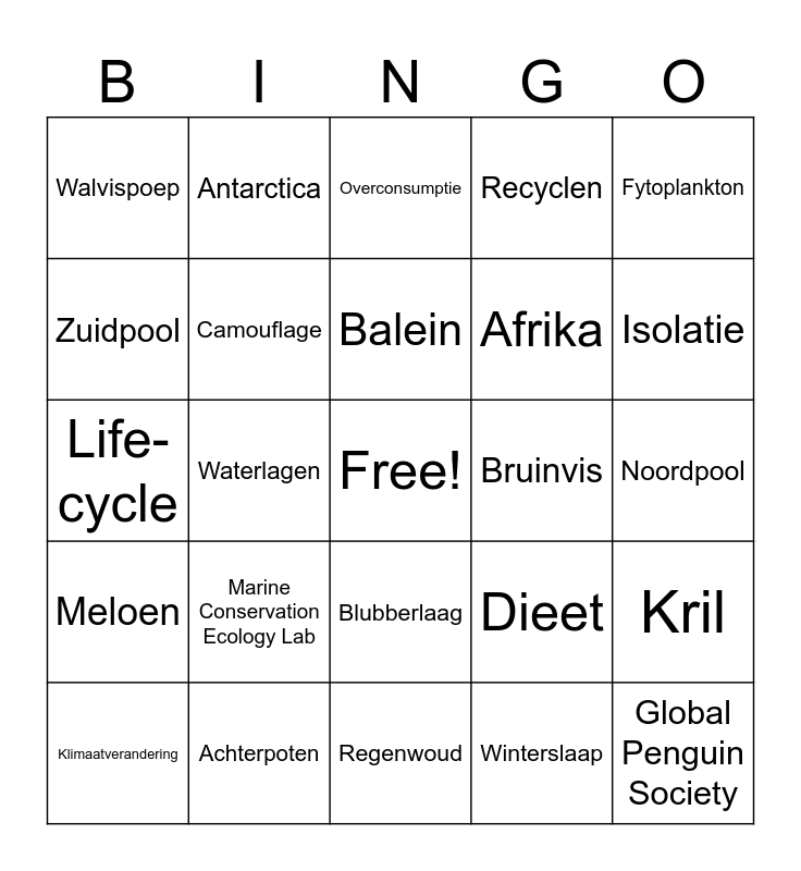 This bingo card has a free space and 32 words: Klimaatverandering, Poolgebied, Regenwoud, Zee-ijs, Noordpool, Zuidpool, Camouflage, Macaroni, Afrika, Overbevissing, Life-cycle, Antarctica, Jachttechniek, Winterslaap, Isolatie, Buisvormig, Achterpoten, Balein, Bruinvis, Kril, Meloen, Echolocatie, Blubberlaag, Dieet, Fytoplankton, Walvispoep, Waterlagen, Overconsumptie, Recyclen, Global Penguin Society, Polar Bears International and Marine Conservation Ecology Lab.