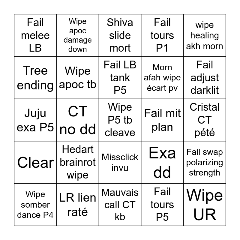 This bingo card has a free space and 24 words: Hedart brainrot wipe, LR lien raté, Fail LB tank P5, Wipe somber dance P4, wipe healing akh morn, Fail melee LB, Tree ending, Wipe apoc damage down, Fail mit plan, Missclick invu, Morn afah wipe écart pv, Juju exa P5, Exa dd, Fail swap polarizing strength, Wipe apoc tb, Fail tours P5, Cristal CT pété, Shiva slide mort, Fail adjust darklit, CT no dd, Wipe UR, Clear, Fail tours P1 and Mauvais call CT kb.
