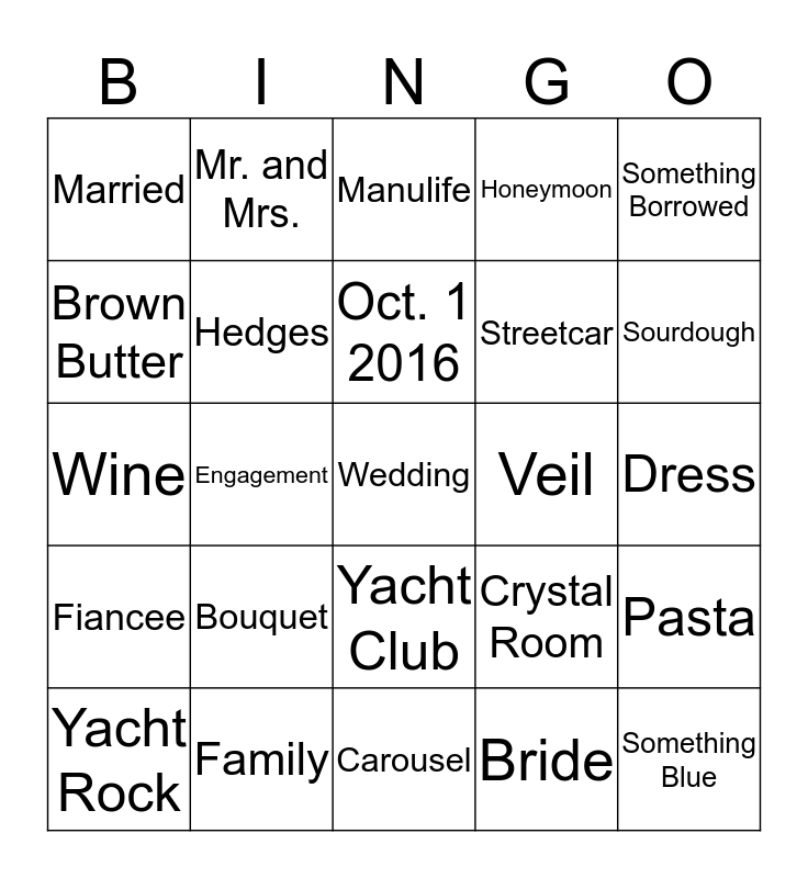 This bingo card has 39 words: Allison, Gareth, Smith, Hedges, Yacht Rock, Yacht Club, Oct. 1 2016, Montreal, Something Borrowed, Fiancee, Engagement, Honeymoon, Wedding, Dress, Veil, Bouquet, Ring, Married, Spaghetti Factory, Crystal Room, Brown Butter, Carousel, Streetcar, Sourdough, Spumoni Ice Cream, Garlic Butter, Something Blue, Vows, Toronto, Mr. and Mrs., Esplanade, OSF Cocktails, Manulife, Family, Bride, Groom, Pasta, Wine and Factory Size.