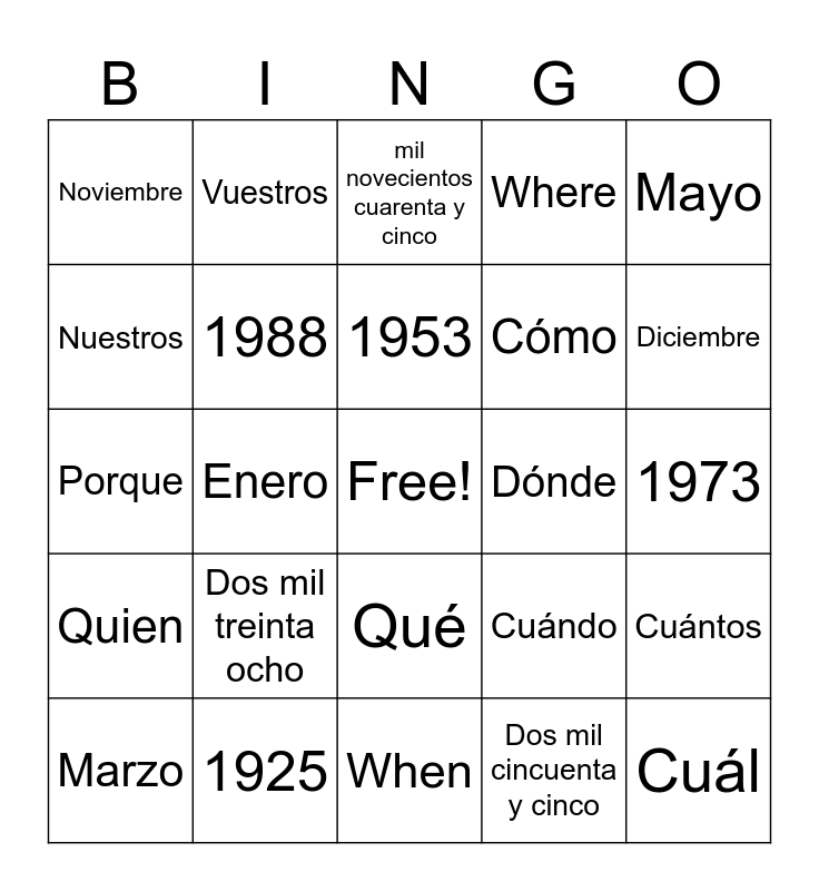 This bingo card has a free space and 24 words: Dos mil treinta ocho, 1925, 1953, Marzo, Mayo, Noviembre, Nuestros, Vuestros, Dónde, Qué, Cómo, Porque, Cuándo, Cuántos, 1988, Dos mil cincuenta y cinco, 1973, mil novecientos cuarenta y cinco, Diciembre, Enero, Cuál, Quien, Where and When.