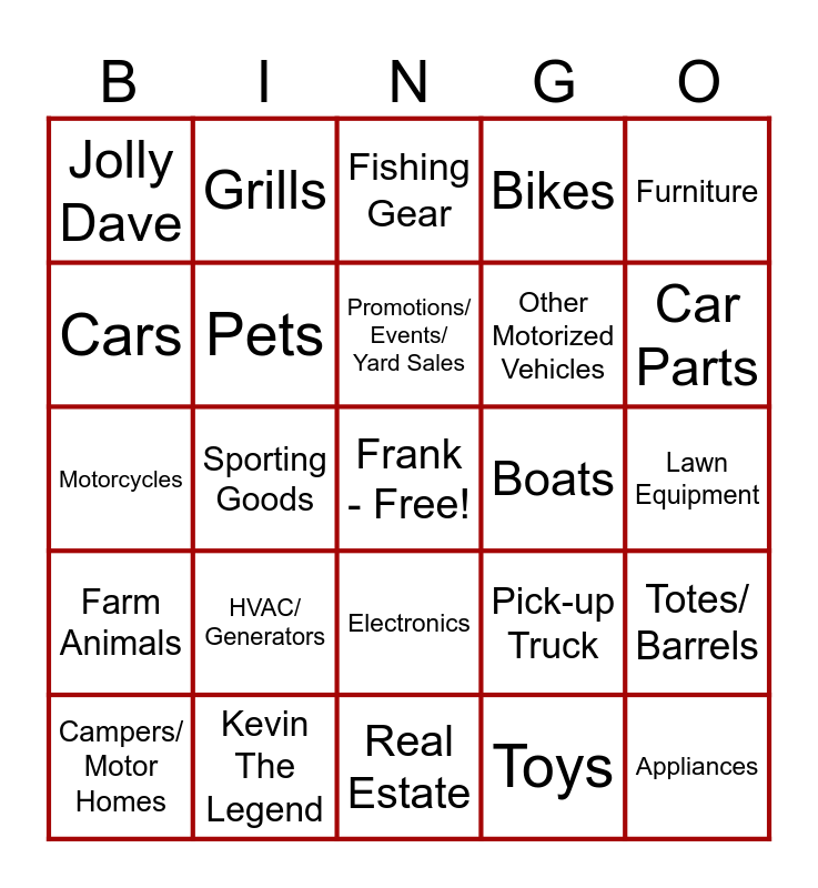 This bingo card has a free space and 31 words: Real Estate, Musical Instruments, Sporting Goods, Tires, Jolly Dave, Fishing Gear, Pets, Pick-up Truck, Boats, Toys, Lawn Equipment, Appliances, Trailers, Farm Equipment, Car Parts, Clothing, Totes/ Barrels, HVAC/ Generators, Farm Animals, Electronics, Furniture, Tools, Campers/ Motor Homes, Grills, Other Motorized Vehicles, Cars, Bikes, Motorcycles, Kevin The Legend, Promotions/ Events/ Yard Sales and Wood.