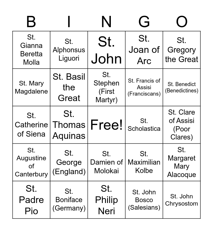 This bingo card has a free space and 76 words: St. Peter, St. Paul, St. John, St. Andrew, St. James the Greater, St. Thomas, St. Matthew, St. Bartholomew, St. James the Less, St. Philip, St. Simon, St. Jude Thaddeus, St. Stephen (First Martyr), St. Mary Magdalene, St. Augustine, St. Thomas Aquinas, St. Teresa of Ávila, St. John Chrysostom, St. Ambrose, St. Gregory the Great, St. Jerome, St. Catherine of Siena, St. Basil the Great, St. Alphonsus Liguori, St. Joan of Arc, St. Agnes, St. Cecilia, St. Lawrence, St. Sebastian, St. Perpetua, St. Felicity, St. Polycarp, St. Ignatius of Antioch, St. Maximilian Kolbe, St. Benedict (Benedictines), St. Francis of Assisi (Franciscans), St. Dominic (Dominicans), St. Ignatius of Loyola (Jesuits), St. Clare of Assisi (Poor Clares), St. John Bosco (Salesians), St. Teresa of Calcutta (Missionaries of Charity), St. Alphonsus Liguori (Redemptorists), St. Vincent de Paul (Lazarists), St. Bruno (Carthusians), St. Thérèse of Lisieux, St. John Paul II, St. Padre Pio, St. Gianna Beretta Molla, St. Josemaría Escrivá, St. Oscar Romero, St. Kateri Tekakwitha, St. Damien of Molokai, St. André Bessette, St. Edith Stein, St. Michael the Archangel (Protection, Soldiers), St. Anthony of Padua (Lost Items), St. Joseph (Workers, Fathers), St. Anne (Mothers, Grandparents), St. Nicholas (Children, Sailors), St. Patrick (Ireland), St. George (England), St. Valentine (Love), St. Lucy (Eyes), St. Blaise (Throats), Female Saints, St. Elizabeth Ann Seton, St. Scholastica, St. Rose of Lima, St. Bridget of Sweden, St. Monica, St. Margaret Mary Alacoque, St. Augustine of Canterbury, St. Boniface (Germany), St. Barnabas (Companion of St. Paul), St. Philip Neri and St. John of the Cross.