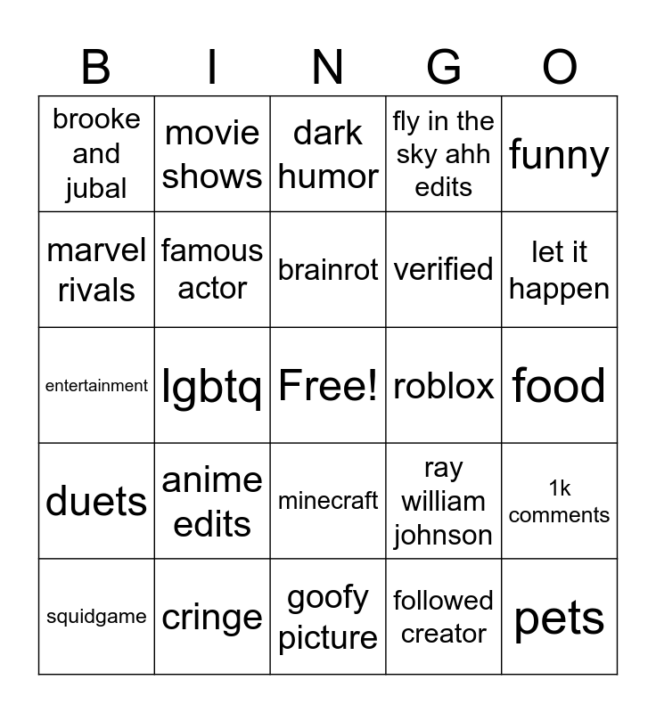 This bingo card has a free space and 24 words: anime edits, cringe, brainrot, squidgame, funny, brooke and jubal, marvel rivals, movie shows, roblox, minecraft, verified, entertainment, ray william johnson, 1k comments, famous actor, followed creator, food, dark humor, let it happen, lgbtq, pets, duets, fly in the sky ahh edits and goofy picture.