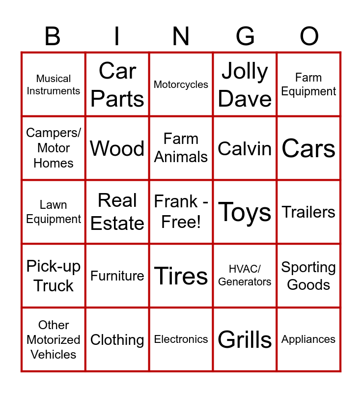 This bingo card has a free space and 33 words: Fishing Gear, Pets, Real Estate, Bikes, Pick-up Truck, Wood, Farm Equipment, Other Motorized Vehicles, Car Parts, Tools, Farm Animals, Motorcycles, Kevin The Legend, Totes/ Barrels, Toys, Cars, Clothing, Lawn Equipment, Furniture, HVAC/ Generators, Tires, Boats, Musical Instruments, Trailers, Electronics, Appliances, Jolly Dave, Calvin, Campers/ Motor Homes, Sporting Goods, Promotions/ Events/ Yard Sales, Grills and Antiques/ Collectibles.