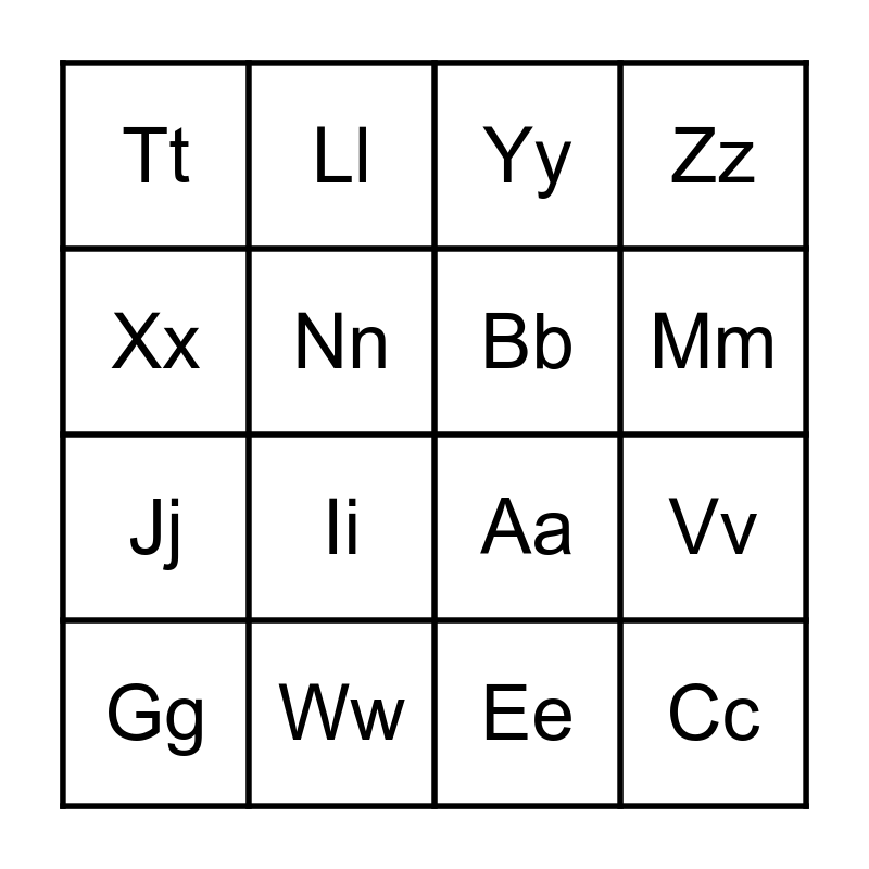 This bingo card has 27 words: Qq, Rr, Jj, Dd, Nn, Yy, Ll, Cc, Ww, Hh, Aa, Zz, Ff, Uu, Ii, Pp, Bb, Mm, Oo, Tt, Ee, Ss, Vv, Gg, Kk, Xx and Ii.