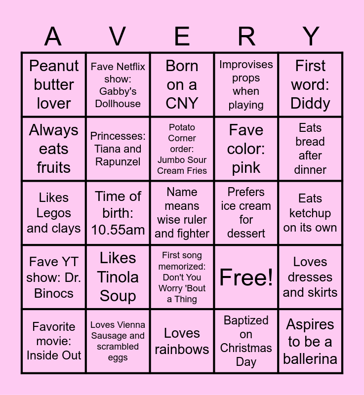 This bingo card has 27 words: Free!, Aspires to be a ballerina, Fave color: pink, Loves rainbows, Always eats fruits, Born on a CNY, Fave Netflix show: Gabby's Dollhouse, Fave YT show: Dr. Binocs, Prefers ice cream for dessert, Loves dresses and skirts, Likes Legos and clays, Improvises props when playing, Favorite movie: Inside Out, Loves Vienna Sausage and scrambled eggs, Eats bread after dinner, Favorite Disney, Princesses: Tiana and Rapunzel, Potato Corner order: Jumbo Sour Cream Fries, Likes Tinola Soup, Peanut butter lover, Eats ketchup on its own, Baptized on Christmas Day, Time of birth: 10.55am, Name means wise ruler and fighter, First song memorized: Don't You Worry 'Bout a Thing, First word: Diddy and Fave lullabye: Tuwing Umuulan.