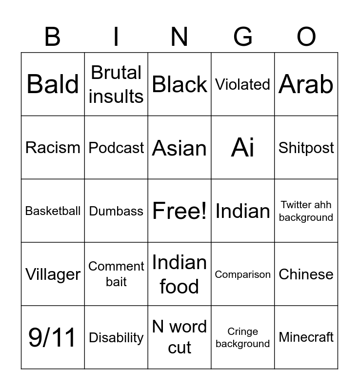 This bingo card has a free space and 24 words: Comment bait, Disability, Asian, 9/11, Arab, Bald, Racism, Brutal insults, Indian, Indian food, Ai, Basketball, Comparison, Chinese, Podcast, Cringe background, Twitter ahh background, Black, Shitpost, Dumbass, Minecraft, Villager, Violated and N word cut.