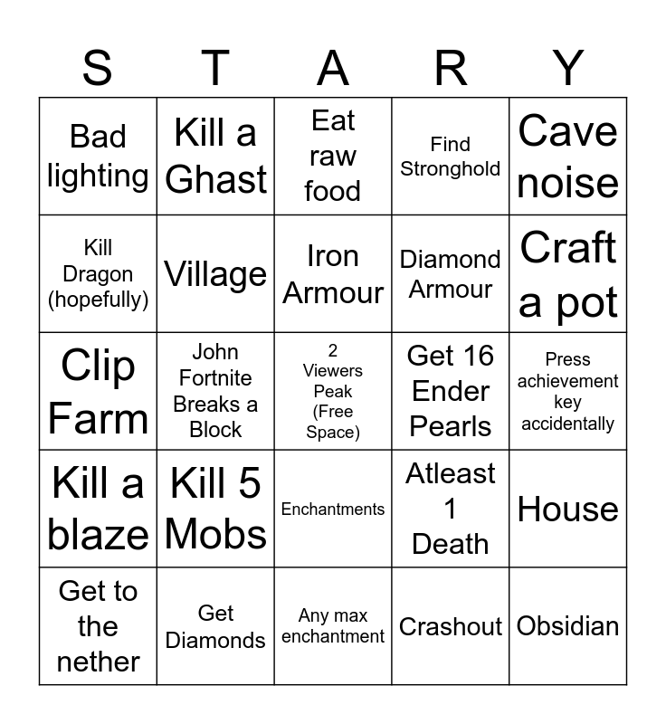 This bingo card has a free space and 24 words: Kill 5 Mobs, Get Diamonds, Iron Armour, Get to the nether, Cave noise, Bad lighting, Kill Dragon (hopefully), Kill a Ghast, Get 16 Ender Pearls, Enchantments, Diamond Armour, Clip Farm, Atleast 1 Death, House, Village, Crashout, Press achievement key accidentally, Eat raw food, Craft a pot, John Fortnite Breaks a Block, Obsidian, Kill a blaze, Find Stronghold and Any max enchantment.