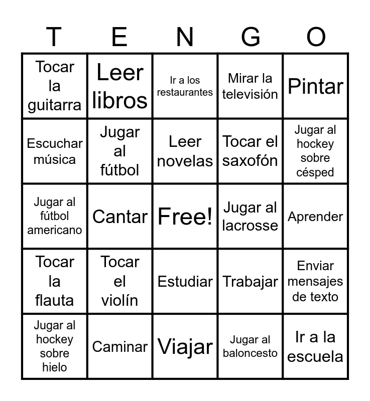 This bingo card has a free space and 63 words: Navegar por internet, Usar la computadora, Textear, Enviar mensajes de texto, Hablar, Hablar por teléfono, Leer libros, Leer revistas, Leer novelas, Escribir cuentos, Estudiar, Hacer la tarea, Aprender, Pintar, Dibujar, Escuchar música, Cantar, Tocar la guitarra, Tocar el piano, Tocar el saxofón, Tocar el violín, Tocar la flauta, Mirar la televisión, Ver televisión, Ir al cine, Ver una película, Jugar videojuegos, Hacer ejercicio, Nadar, Practicar la natación, Montar en patineta, Montar en monopatín, Patinar, Patinar sobre hielo, Jugar al hockey sobre césped, Jugar al hockey sobre hielo, Jugar al béisbol, Jugar al baloncesto, Jugar al voleibol, Jugar al fútbol, Jugar al fútbol americano, Jugar al lacrosse, Jugar al tenis, Jugar a los bolos (boliche), Ir a la escuela, Caminar, Ayudar en casa, Trabajar, Cocinar, Descansar, Dormir, Viajar, Ir de viaje, Acampar, Salir con amigos, Ir a los restaurantes, Comer en los restaurantes, Esquiar, Montar en bicicleta, Ir de compras, Correr, Pasar tiempo solo and Pasar tiempo sola.