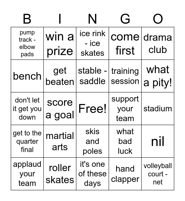 This bingo card has a free space and 24 words: martial arts, roller skates, stable - saddle, applaud your team, drama club, pump track - elbow pads, bench, win a prize, support your team, skis and poles, training session, don't let it get you down, what bad luck, nil, get beaten, hand clapper, stadium, ice rink - ice skates, what a pity!, score a goal, volleyball court - net, get to the quarter final, come first and it's one of these days.