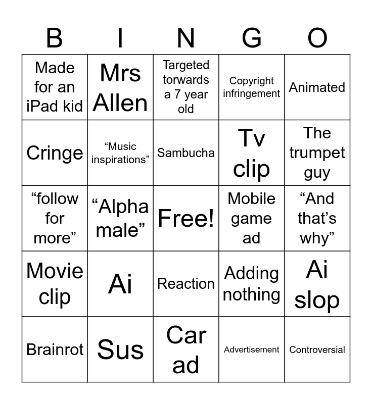 This bingo card has a free space and 24 words: Ai, Sus, Sambucha, Brainrot, Animated, Made for an iPad kid, Cringe, Mrs Allen, Mobile game ad, Reaction, Tv clip, “follow for more”, Adding nothing, Ai slop, “Music inspirations”, Advertisement, “And that’s why”, Targeted torwards a 7 year old, The trumpet guy, “Alpha male”, Controversial, Movie clip, Copyright infringement and Car ad.