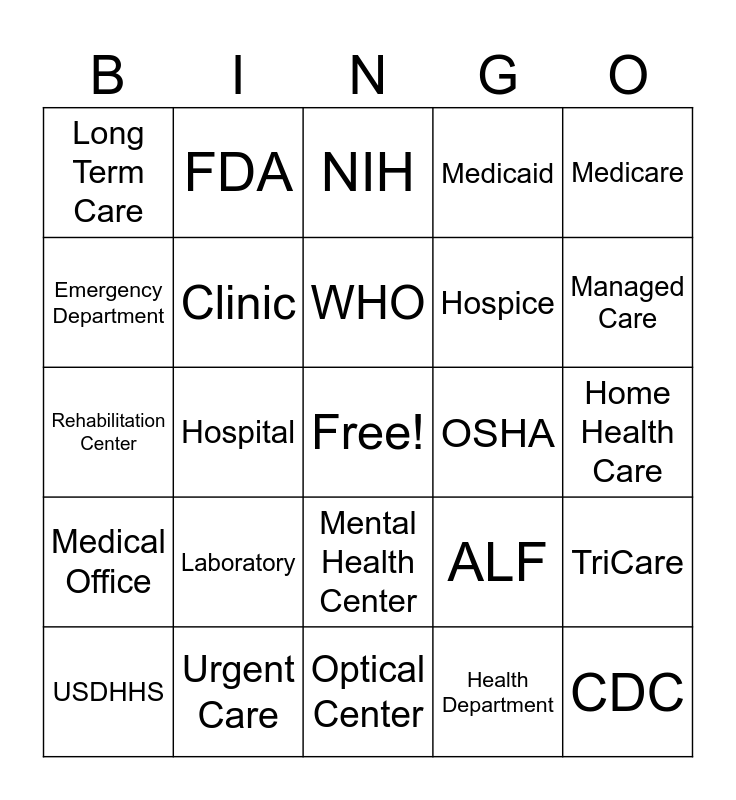 This bingo card has a free space and 24 words: Laboratory, Urgent Care, WHO, USDHHS, Medicare, Long Term Care, Emergency Department, FDA, OSHA, Mental Health Center, Hospice, Rehabilitation Center, ALF, TriCare, Clinic, Health Department, Home Health Care, NIH, Managed Care, Hospital, CDC, Medical Office, Medicaid and Optical Center.