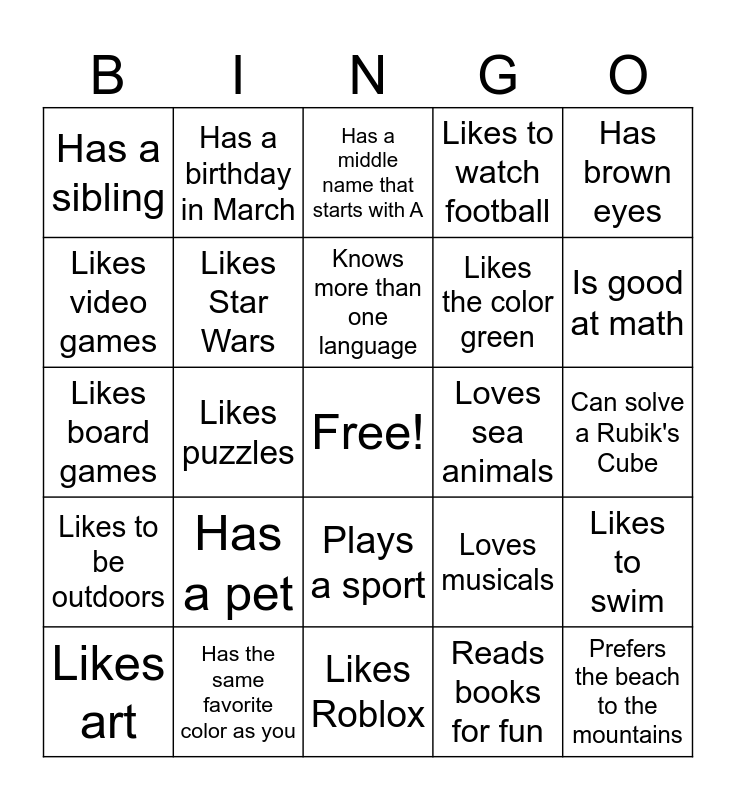 This bingo card has a free space and 24 words: Has a pet, Has the same favorite color as you, Knows more than one language, Likes art, Has brown eyes, Has a sibling, Likes video games, Has a birthday in March, Loves sea animals, Plays a sport, Likes the color green, Likes board games, Loves musicals, Likes to swim, Likes Star Wars, Reads books for fun, Can solve a Rubik's Cube, Has a middle name that starts with A, Is good at math, Likes puzzles, Prefers the beach to the mountains, Likes to be outdoors, Likes to watch football and Likes Roblox.