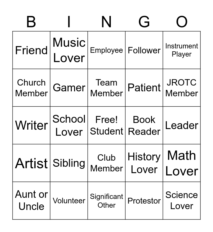 This bingo card has a free space and 24 words: Sibling, Volunteer, Team Member, Aunt or Uncle, Instrument Player, Friend, Church Member, Music Lover, Book Reader, Club Member, Patient, Writer, History Lover, Math Lover, Gamer, Protestor, Leader, Employee, JROTC Member, School Lover, Science Lover, Artist, Follower and Significant Other.