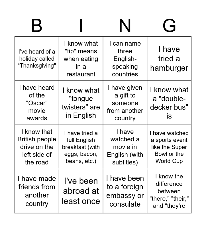This bingo card has 16 words: I've been abroad at least once, I have watched a sports event like the Super Bowl or the World Cup, I can name three English-speaking countries, I’ve heard of a holiday called “Thanksgiving", I know that British people drive on the left side of the road, I know what "tip" means when eating in a restaurant, I have watched a movie in English (with subtitles), I have been to a foreign embassy or consulate, I have heard of the "Oscar" movie awards, I know what "tongue twisters" are in English, I have made friends from another country, I have tried a hamburger, I have tried a full English breakfast (with eggs, bacon, beans, etc.), I know what a "double-decker bus" is, I have given a gift to someone from another country and I know the difference between "there," "their," and "they’re.