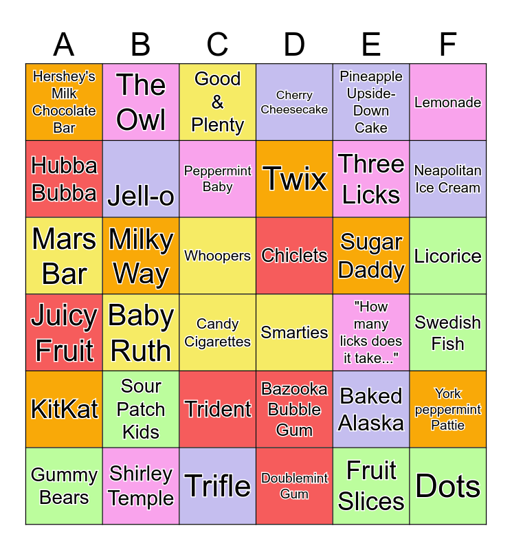 This bingo card has 36 words: Bazooka Bubble Gum, Trident, Doublemint Gum, Hubba Bubba, Juicy Fruit, Chiclets, Jell-o, Trifle, Pineapple Upside-Down Cake, Baked Alaska, Neapolitan Ice Cream, Cherry Cheesecake, York peppermint Pattie, Milky Way, Twix, Hershey's Milk Chocolate Bar, KitKat, Sugar Daddy, Mars Bar, Good & Plenty, Whoopers, Baby Ruth, Smarties, Candy Cigarettes, "How many licks does it take...", The Owl, Three Licks, Shirley Temple, Peppermint Baby, Lemonade, Dots, Gummy Bears, Swedish Fish, Licorice, Sour Patch Kids and Fruit Slices.