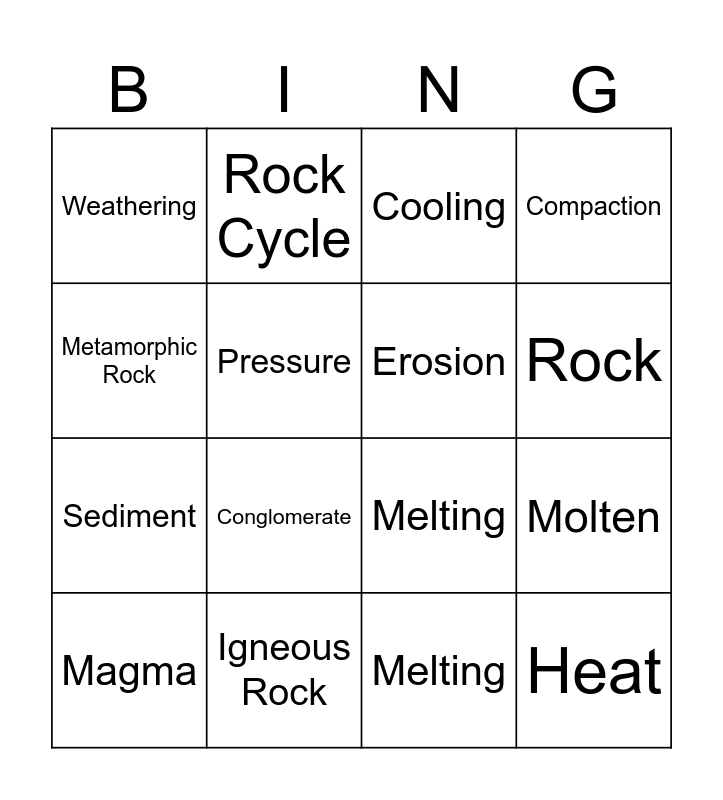 This bingo card has 20 words: Molten, Crystal, Cooling, Lava, Magma, Metamorphic Rock, Igneous Rock, Weathering, Sediment, Rock Cycle, Conglomerate, Melting, Pressure, Heat, Erosion, Sedimentary Rock, Rock, Compaction, Melting and Cementing.