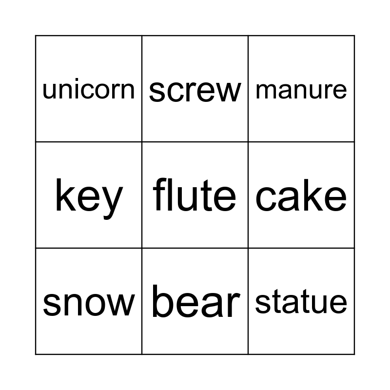 This bingo card has 14 words: boy, strawberry, snow, screw, key, flute, statue, toe, bear, unicorn, astronaut, cake, manure and queen.