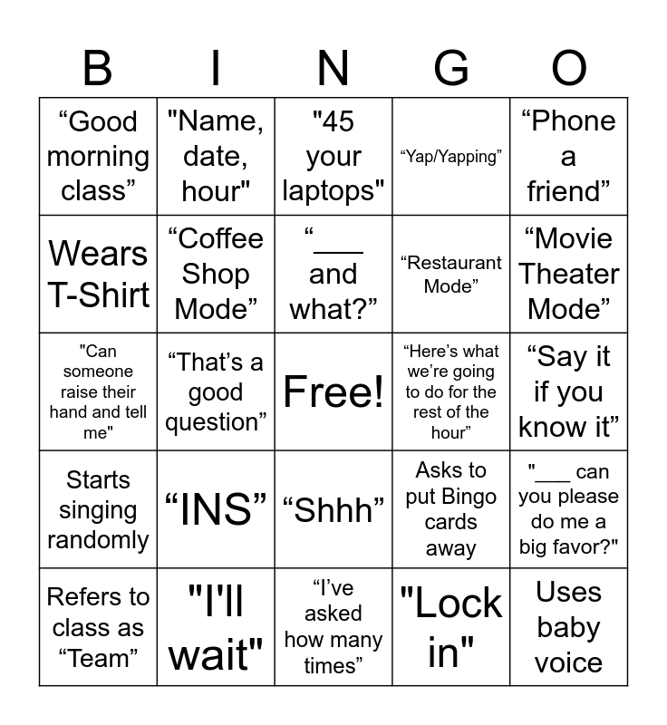 This bingo card has a free space and 39 words: “FANBOYS”, “Alright guys..”, “Checks and X’s”, “Coffee Shop Mode”, Refers to class as “Team”, “Shhh”, “___ and what?”, “I want ___ hands in the air”, “Phone a friend”, Starts singing randomly, “That’s a good question”, “Yap/Yapping”, Uses baby voice, “Say it if you know it”, “Here’s what we’re going to do for the rest of the hour”, “INS”, “You all need to remember you are…”, “Good morning class”, Notices Bingo cards, Asks to put Bingo cards away, Wears T-Shirt, “I’ve asked how many times”, “Restaurant Mode”, “Movie Theater Mode”, “Grocery Store Mode”, "Turn and look at me", "I know ___ knows", "Start us off please ___", "Sit up tall for me", "Name, date, hour", Random Hand Gestures, "Get your materials out", "45 your laptops", "I'll wait", "Lock in", Referers to students as "Dears", "___ can you please do me a big favor?", "Can someone raise their hand and tell me" and "What is next on our agenda?".
