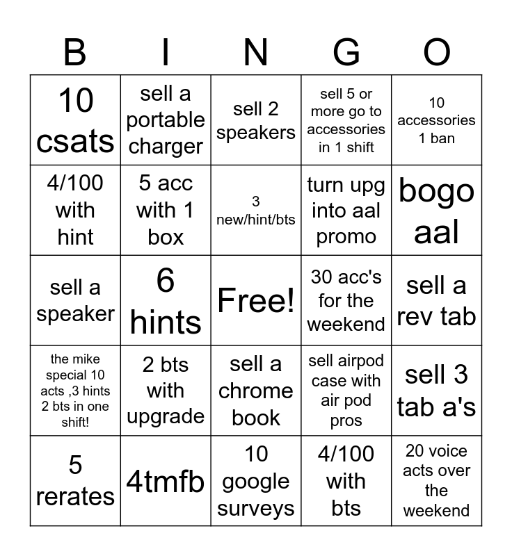 This bingo card has a free space and 24 words: 2 bts with upgrade, 4tmfb, 3 new/hint/bts, 5 rerates, 10 accessories 1 ban, 10 csats, 4/100 with hint, sell a portable charger, 30 acc's for the weekend, sell a chrome book, turn upg into aal promo, sell a speaker, sell airpod case with air pod pros, sell 3 tab a's, 5 acc with 1 box, 4/100 with bts, sell a rev tab, sell 2 speakers, bogo aal, 6 hints, 20 voice acts over the weekend, the mike special 10 acts ,3 hints 2 bts in one shift!, sell 5 or more go to accessories in 1 shift and 10 google surveys.