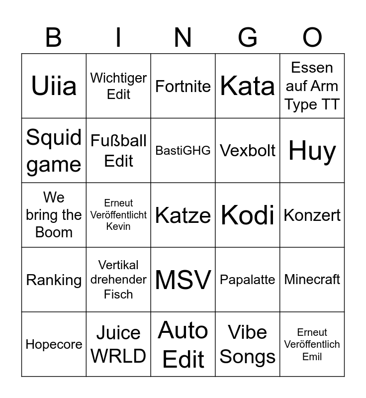 This bingo card has a free space and 24 words: Vertikal drehender Fisch, Juice WRLD, BastiGHG, Hopecore, Essen auf Arm Type TT, Uiia, Squid game, Wichtiger Edit, Kodi, MSV, Vexbolt, We bring the Boom, Papalatte, Minecraft, Fußball Edit, Vibe Songs, Konzert, Fortnite, Huy, Erneut Veröffentlicht Kevin, Erneut Veröffentlich Emil, Ranking, Kata and Auto Edit.