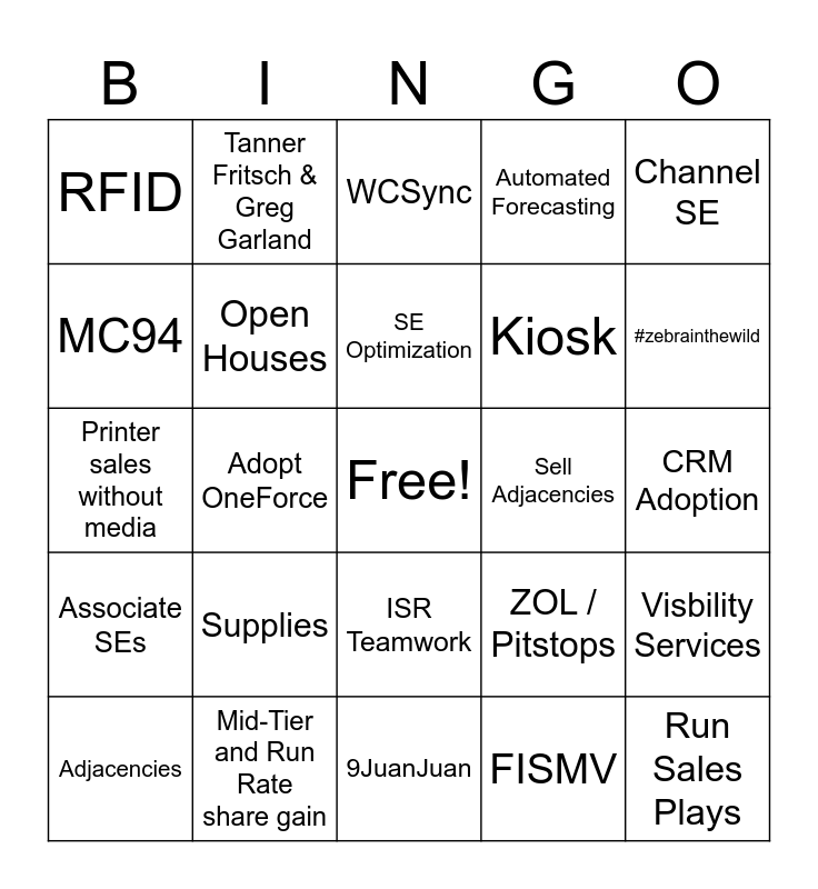 This bingo card has a free space and 40 words: Zessentials Launch, Printer sales without media, RFID Media Growth - 155%, Open Houses, Mid-Tier and Run Rate share gain, ISR Teamwork, SE Optimization, Territory SE, Channel SE, Associate SEs, Adopt OneForce, Automated Forecasting, Run Sales Plays, CRM Adoption, Sell Adjacencies, Supplies, ZAM - Intelligent Cabinets, RFID, Device Tracker, WCSync, Visbility Services, FISMV, Kiosk, MC94, EOS MC9x Contracts Data, Blitz Days, My Analytics, Four, ZEC/EBC, NY Jets, QSR, Adjacencies, Key marketing trends, ZOL / Pitstops, #zebrainthewild, 9JuanJuan, The People Team, Four, Tanner Fritsch & Greg Garland and FTO/PTO/VTO.