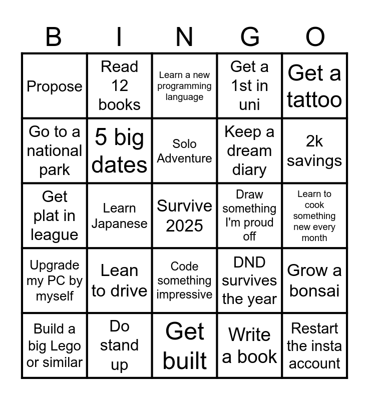 This bingo card has a free space and 24 words: Lean to drive, Do stand up, Solo Adventure, Build a big Lego or similar, Get a tattoo, Propose, Go to a national park, Read 12 books, Draw something I'm proud off, Code something impressive, Keep a dream diary, Get plat in league, DND survives the year, Grow a bonsai, 5 big dates, Write a book, Learn to cook something new every month, Learn a new programming language, 2k savings, Learn Japanese, Restart the insta account, Upgrade my PC by myself, Get a 1st in uni and Get built.