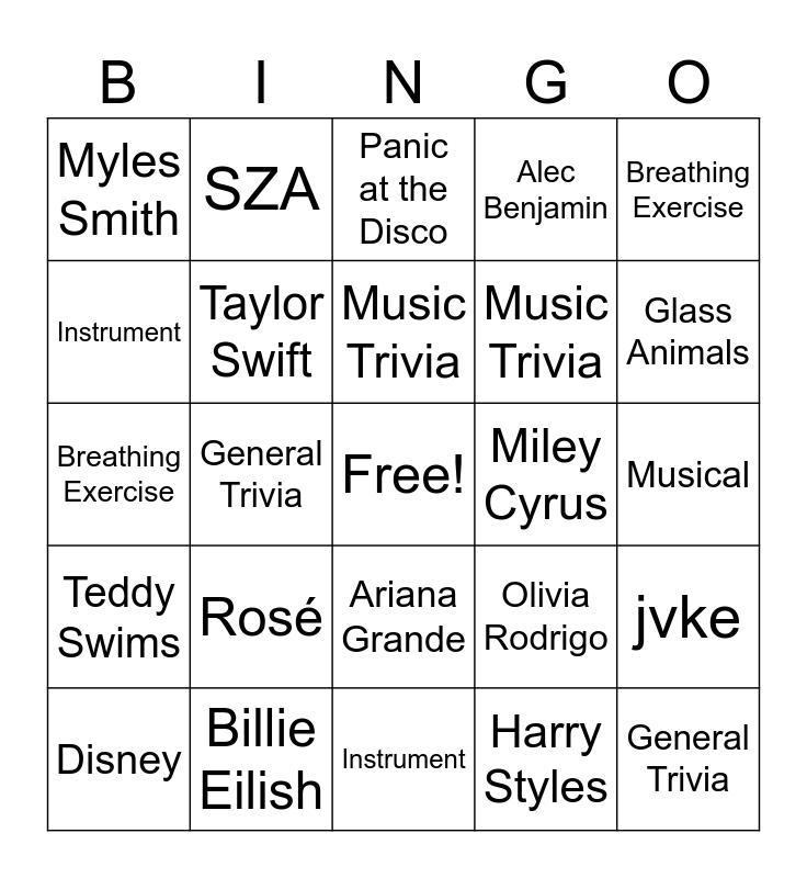 This bingo card has a free space and 24 words: Rosé, Billie Eilish, Music Trivia, Disney, Breathing Exercise, Myles Smith, Instrument, SZA, Miley Cyrus, Ariana Grande, Music Trivia, Breathing Exercise, Olivia Rodrigo, jvke, Taylor Swift, Harry Styles, Musical, Panic at the Disco, Glass Animals, General Trivia, General Trivia, Teddy Swims, Alec Benjamin and Instrument.