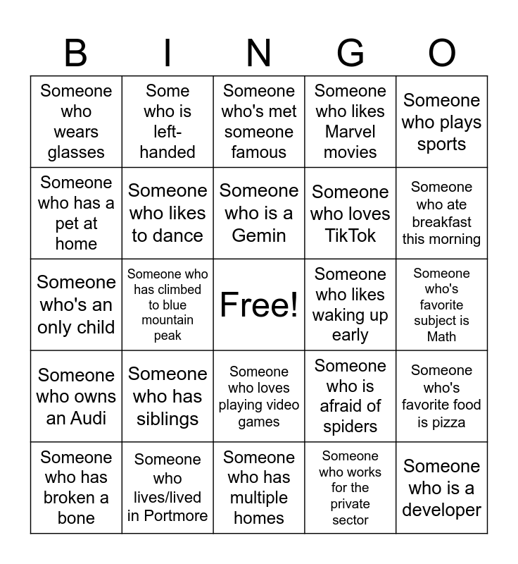 This bingo card has a free space and 24 words: Someone who has siblings, Someone who lives/lived in Portmore, Someone who is a Gemin, Someone who has broken a bone, Someone who plays sports, Someone who wears glasses, Someone who has a pet at home, Some who is left-handed, Someone who likes waking up early, Someone who loves playing video games, Someone who loves TikTok, Someone who's an only child, Someone who is afraid of spiders, Someone who's favorite food is pizza, Someone who likes to dance, Someone who works for the private sector, Someone who's favorite subject is Math, Someone who's met someone famous, Someone who ate breakfast this morning, Someone who has climbed to blue mountain peak, Someone who is a developer, Someone who owns an Audi, Someone who likes Marvel movies and Someone who has multiple homes.
