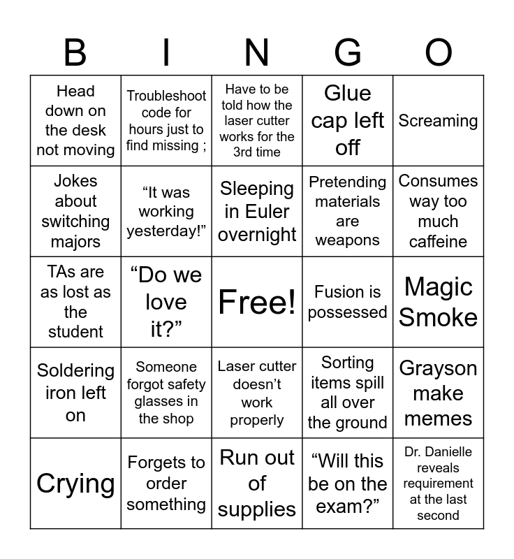 This bingo card has a free space and 24 words: Someone forgot safety glasses in the shop, Forgets to order something, Sleeping in Euler overnight, Crying, Screaming, Head down on the desk not moving, Jokes about switching majors, Troubleshoot code for hours just to find missing ;, Fusion is possessed, Laser cutter doesn’t work properly, Pretending materials are weapons, TAs are as lost as the student, Sorting items spill all over the ground, Grayson make memes, “It was working yesterday!”, “Will this be on the exam?”, Magic Smoke, Have to be told how the laser cutter works for the 3rd time, Consumes way too much caffeine, “Do we love it?”, Dr. Danielle reveals requirement at the last second, Soldering iron left on, Glue cap left off and Run out of supplies.