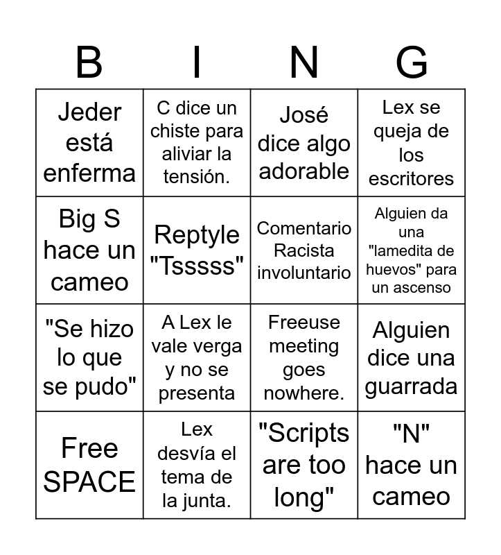 This bingo card has 16 words: Lex desvía el tema de la junta., Alguien dice una guarrada, José dice algo adorable, Jeder está enferma, "Se hizo lo que se pudo", C dice un chiste para aliviar la tensión., Freeuse meeting goes nowhere., "Scripts are too long", Big S hace un cameo, Reptyle "Tsssss", Free SPACE, Lex se queja de los escritores, A Lex le vale verga y no se presenta, Alguien da una "lamedita de huevos" para un ascenso, Comentario Racista involuntario and "N" hace un cameo.