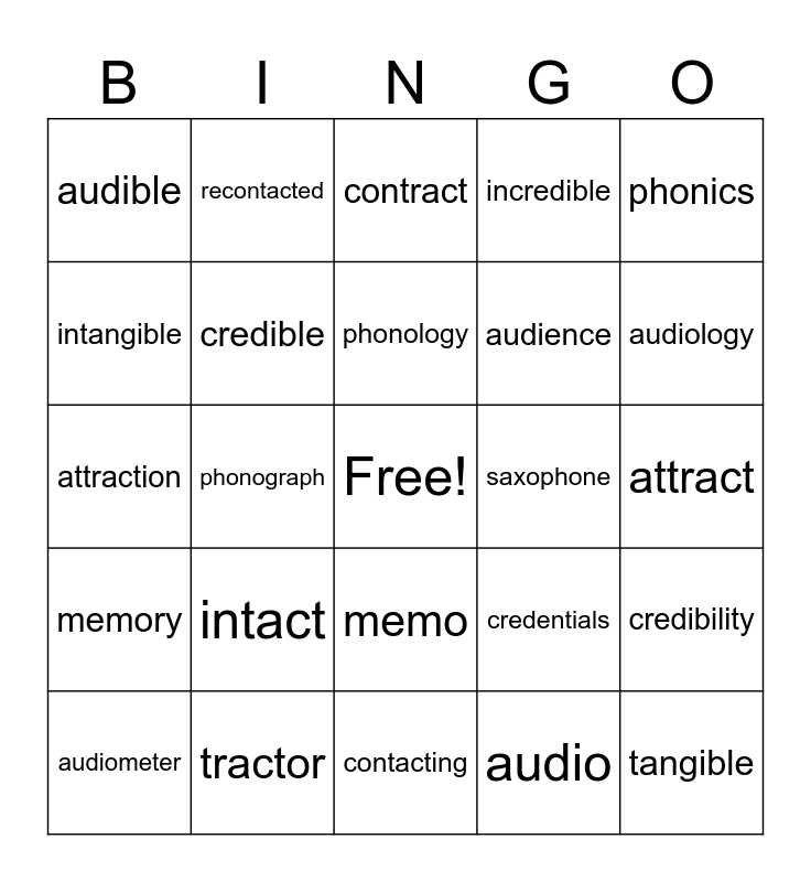 This bingo card has a free space and 47 words: contact, tangible, tactful, contacting, intact, recontact, recontacted, tactfully, intangible, credit, credible, incredible, credibility, credentials, telephone, microphone, phonology, saxophone, symphony, phonics, phonograph, audio, audible, audience, auditorium, audiology, audiometer, audition, memo, memory, remember, rememberance, memorial, memorable, commemorate, tractor, attract, attraction, subtract, distract, extract, contract, attraction, subtracted, distracted, contraction and contracting.