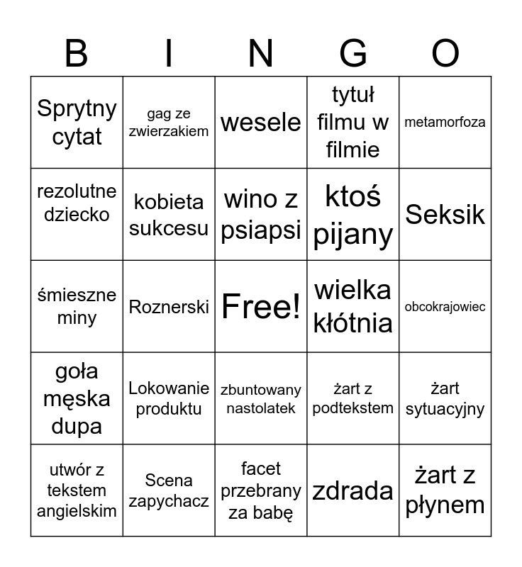 This bingo card has a free space and 24 words: Lokowanie produktu, Scena zapychacz, wino z psiapsi, utwór z tekstem angielskim, metamorfoza, Sprytny cytat, rezolutne dziecko, gag ze zwierzakiem, wielka kłótnia, zbuntowany nastolatek, ktoś pijany, śmieszne miny, żart z podtekstem, żart sytuacyjny, kobieta sukcesu, zdrada, obcokrajowiec, wesele, Seksik, Roznerski, żart z płynem, goła męska dupa, tytuł filmu w filmie and facet przebrany za babę.