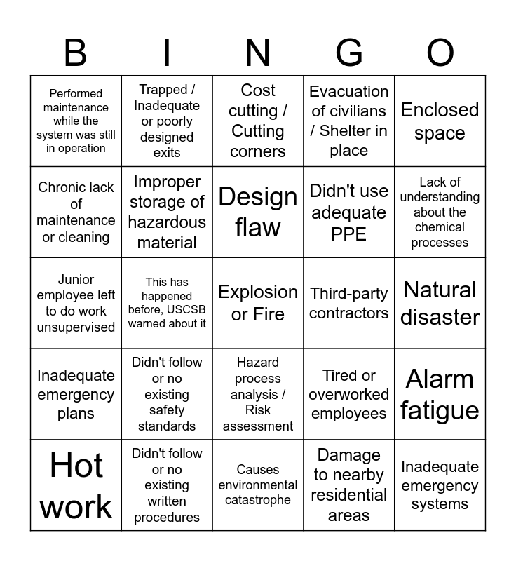 This bingo card has a free space and 24 words: Didn't follow or no existing safety standards, Didn't follow or no existing written procedures, Design flaw, Hot work, Enclosed space, Performed maintenance while the system was still in operation, Chronic lack of maintenance or cleaning, Trapped / Inadequate or poorly designed exits, Third-party contractors, Hazard process analysis / Risk assessment, Didn't use adequate PPE, Junior employee left to do work unsupervised, Tired or overworked employees, Alarm fatigue, Improper storage of hazardous material, Damage to nearby residential areas, Natural disaster, Cost cutting / Cutting corners, Lack of understanding about the chemical processes, This has happened before, USCSB warned about it, Inadequate emergency systems, Inadequate emergency plans, Evacuation of civilians / Shelter in place and Causes environmental catastrophe.