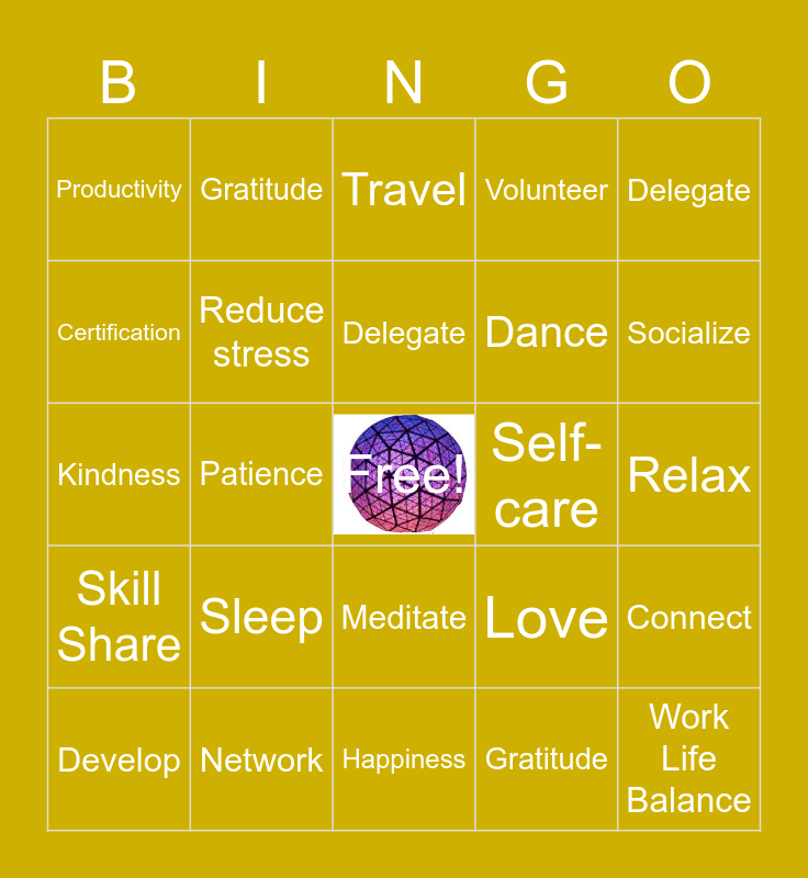 This bingo card has a free space and 103 words: Promote, Raise, Delegate, Network, Mentor, Skill Share, Take Courses, Certification, Organization, Productivity, Efficiency, Work Life Balance, Hold Boundaries, Mindfulness, Growth, Impact, Travel, New hobby, Learn a new skill, Read More, Exercise More, Diet, Cook, Meditate, Relax, Sleep, Socialize, Volunteer, Family time, See friends more, Love, Gratitude, Kindness, Patience, Happiness, Side Hustle, Promote, Raise, Delegate, Network, Mentor, Skill Share, Take Courses, Certification, Organization, Productivity, Efficiency, Work Life Balance, Hold Boundaries, Mindfulness, Growth, Impact, Travel, New hobby, Learn a new skill, Read More, Exercise More, Diet, Cook, Meditate, Relax, Sleep, Socialize, Volunteer, Family time, See friends more, Love, Gratitude, Kindness, Patience, Happiness, Side Hustle, Innovate, Lead, Inspire, Collaborate, Influence, Develop, Improve, Streamline, Automate, Time management, Reduce stress, Professional development, Self-care, Declutter, Organize, Declutter, Budget, Save, Invest, Explore, Connect, Give back, Learn a language, Play an instrument, Dance, Art, Photography, Gardening, Hiking, Camping and Buy a house.