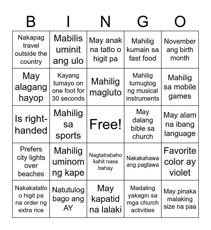 This bingo card has a free space and 24 words: Mahilig uminom ng kape, Natutulog bago ang AY, Mahilig magluto, Nakakatatlo o higit pa na order ng extra rice, November ang birth month, Nakapag travel outside the country, May alagang hayop, Mabilis uminit ang ulo, May dalang bible sa church, Nagtatrabaho kahit nasa bahay, Mahilig tumugtog ng musical instruments, Is right-handed, Nakakahawa ang pagtawa, Favorite color ay violet, Kayang tumayo on one foot for 30 seconds, Madaling yakagin sa mga church activities, May alam na ibang language, May anak na tatlo o higit pa, Mahilig sa mobile games, Mahilig sa sports, May pinaka malaking size na paa, Prefers city lights over beaches, Mahilig kumain sa fast food and May kapatid na lalaki.