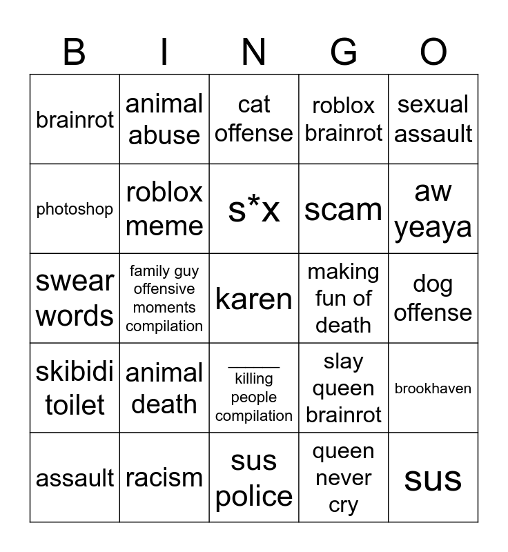 This bingo card has a free space and 24 words: animal death, racism, s*x, assault, sexual assault, brainrot, photoshop, animal abuse, making fun of death, ______ killing people compilation, scam, swear words, slay queen brainrot, brookhaven, roblox meme, queen never cry, dog offense, cat offense, aw yeaya, family guy offensive moments compilation, sus, skibidi toilet, roblox brainrot and sus police.