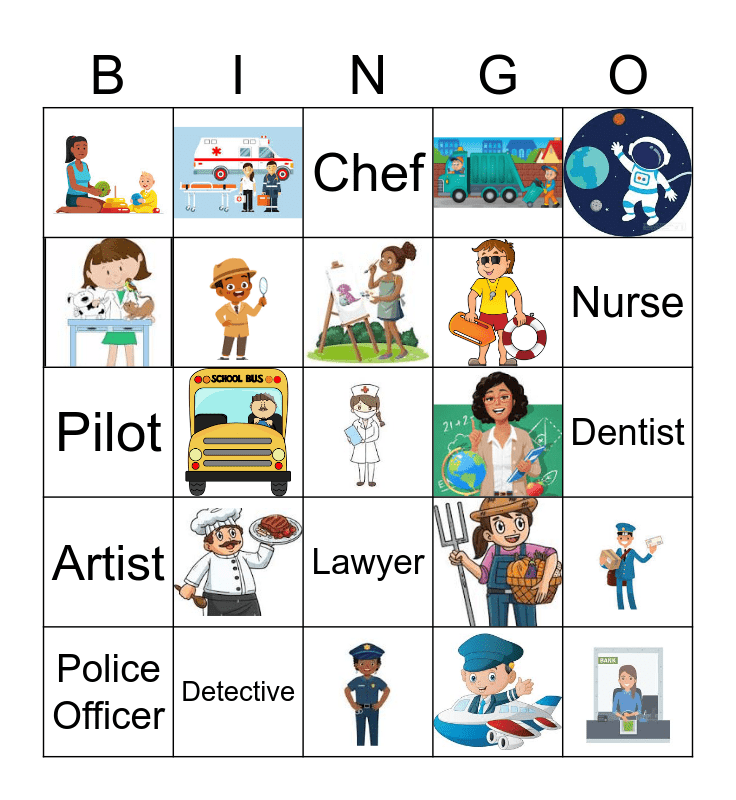 This bingo card has 25 images and 26 words: Free!, Nurse, Firefighter, Police Officer, Chef, Crossing Guard, Paramedic, Baker, Veterinarian, Construction Worker, Detective, Garbage Collector, Mail Carrier, Farmer, Hair Dresser, Dentist, Artist, Teacher, Musician, Astronaut, Bus Driver, Pilot, Babysitter, Lifeguard, Lawyer and Banker.