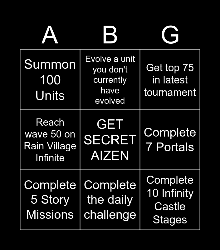 This bingo card has a free space and 8 words: Complete 7 Portals, Get top 75 in latest tournament, Evolve a unit you don't currently have evolved, Complete 5 Story Missions, Summon 100 Units, Complete 10 Infinity Castle Stages, Reach wave 50 on Rain Village Infinite and Complete the daily challenge.