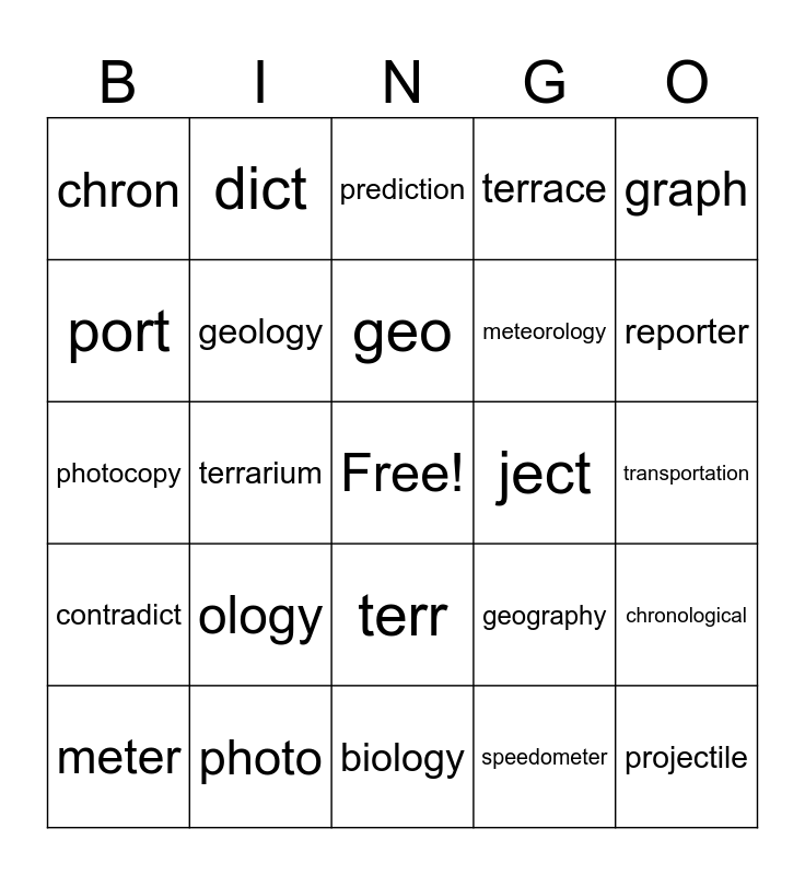 This bingo card has a free space and 24 words: ology, photo, geo, meter, graph, chron, port, dict, ject, terr, meteorology, photocopy, geography, chronological, geology, speedometer, transportation, prediction, reporter, terrarium, projectile, contradict, terrace and biology.