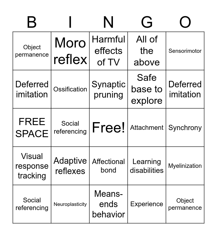 This bingo card has a free space and 24 words: Adaptive reflexes, Neuroplasticity, Synaptic pruning, Social referencing, Sensorimotor, Object permanence, Deferred imitation, Moro reflex, Attachment, Affectional bond, Safe base to explore, FREE SPACE, Learning disabilities, Myelinization, Ossification, Experience, Synchrony, Harmful effects of TV, Deferred imitation, Social referencing, Object permanence, Visual response tracking, All of the above and Means-ends behavior.