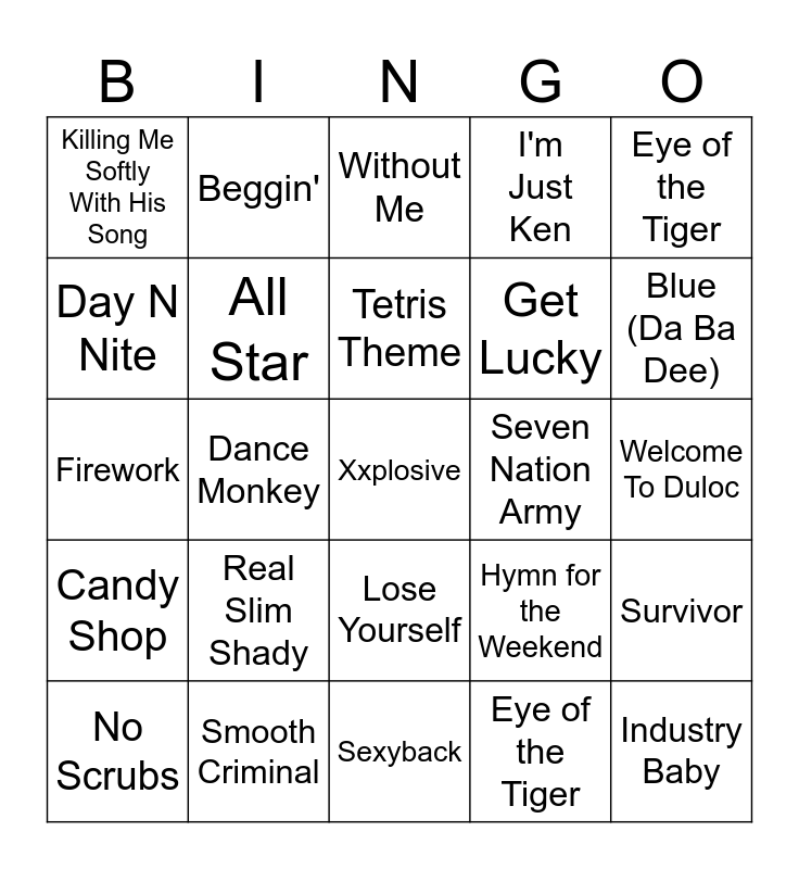 This bingo card has 77 words: You Spin Me Right Round, Umbrella, Without Me, Mii Channel, American Boy, Bye Bye Bye, Taking the Hobbits to Isengard, Old Town Road, Axel F, Everybody (Backstreet's Back), Industry Baby, Never Gonna Give You Up, Tetris Theme, Day N Nite, Africa, Dance Monkey, Crazy in Love, Xxplosive, Funkytown, Eye of the Tiger, Wonderwall, Firework, All Star, Beggin', I'm Just Ken, Never Gonna Give You Up, Blinding Lights, Bella Ciao, Halo Theme, Industry Baby, California Love, Mr. Brightside, Mortal Kombat Theme, Hymn for the Weekend, Blue (Da Ba Dee), Get Lucky, Boulevard of Broken Dreams, Big Poppa, Welcome To Duloc, Eye of the Tiger, Under the Bridge, Escape (The Pina Colada Song), Hey Ya!, Forgot About Dre, The Final Countdown, Take on Me, No Scrubs, Killing Me Softly With His Song, Back In Black, X Gon' Give It To Ya, Smack That, Lose Yourself, Megalovania, Beat It, Hips Don't Lie, Smells Like Teen Spirit, Numb Encore, On Melancholy Hill, Kings & Queens, I Want It That Way, Real Slim Shady, Shape Of You, Bad Guy, Stan, Running Up That Hill, Stronger, Billie Jean, Seven Nation Army, Angry Birds Theme, Dark Horse, Gangsta's Paradise, Survivor, Candy Shop, Smooth Criminal, Take On Me, Sexyback and Hallelujah.