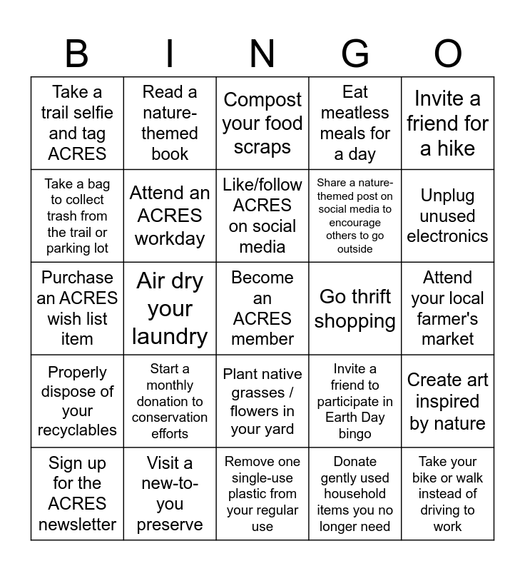 This bingo card has a free space and 24 words: Start a monthly donation to conservation efforts, Visit a new-to-you preserve, Like/follow ACRES on social media, Sign up for the ACRES newsletter, Invite a friend for a hike, Take a trail selfie and tag ACRES, Take a bag to collect trash from the trail or parking lot, Read a nature-themed book, Go thrift shopping, Plant native grasses / flowers in your yard, Share a nature-themed post on social media to encourage others to go outside, Purchase an ACRES wish list item, Invite a friend to participate in Earth Day bingo, Create art inspired by nature, Attend an ACRES workday, Donate gently used household items you no longer need, Attend your local farmer's market, Compost your food scraps, Unplug unused electronics, Air dry your laundry, Take your bike or walk instead of driving to work, Properly dispose of your recyclables, Eat meatless meals for a day and Remove one single-use plastic from your regular use.