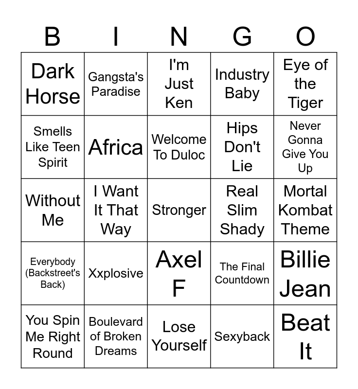 This bingo card has 77 words: Killing Me Softly With His Song, Under the Bridge, I'm Just Ken, Bella Ciao, Shape Of You, Smack That, X Gon' Give It To Ya, American Boy, Hey Ya!, Industry Baby, Beat It, Firework, Welcome To Duloc, Smells Like Teen Spirit, Wonderwall, I Want It That Way, California Love, Stronger, Running Up That Hill, Eye of the Tiger, Stan, Without Me, Africa, Gangsta's Paradise, Industry Baby, Mii Channel, Kings & Queens, Dance Monkey, Big Poppa, Blue (Da Ba Dee), Get Lucky, Never Gonna Give You Up, Candy Shop, The Final Countdown, Never Gonna Give You Up, Hips Don't Lie, Hallelujah, No Scrubs, Mortal Kombat Theme, Sexyback, Back In Black, Escape (The Pina Colada Song), Mr. Brightside, On Melancholy Hill, Halo Theme, Umbrella, You Spin Me Right Round, Dark Horse, Megalovania, Eye of the Tiger, Blinding Lights, Axel F, Take On Me, Survivor, Day N Nite, Take on Me, Smooth Criminal, Forgot About Dre, Funkytown, Beggin', Xxplosive, Hymn for the Weekend, Bad Guy, All Star, Seven Nation Army, Taking the Hobbits to Isengard, Crazy in Love, Real Slim Shady, Angry Birds Theme, Old Town Road, Bye Bye Bye, Billie Jean, Everybody (Backstreet's Back), Boulevard of Broken Dreams, Tetris Theme, Lose Yourself and Numb Encore.