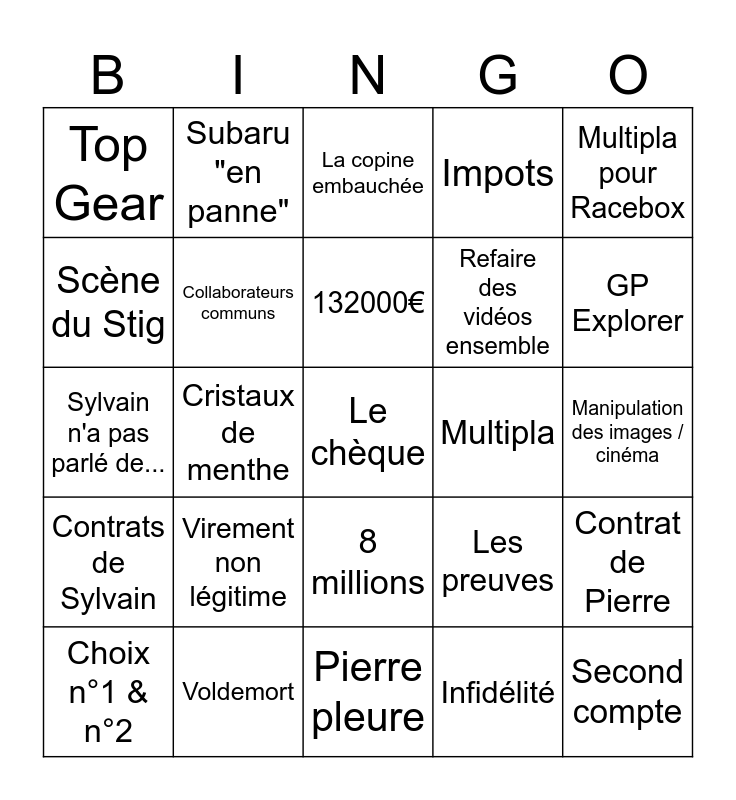 This bingo card has a free space and 24 words: Virement non légitime, Voldemort, 132000€, Choix n°1 & n°2, Multipla pour Racebox, Top Gear, Scène du Stig, Subaru "en panne", Multipla, 8 millions, Refaire des vidéos ensemble, Sylvain n'a pas parlé de..., Les preuves, Contrat de Pierre, Collaborateurs communs, Infidélité, Manipulation des images / cinéma, La copine embauchée, GP Explorer, Cristaux de menthe, Second compte, Contrats de Sylvain, Impots and Pierre pleure.
