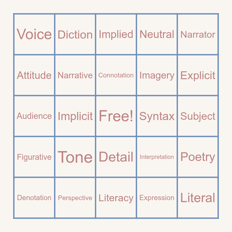 This bingo card has a free space and 24 words: Tone, Perspective, Connotation, Denotation, Narrator, Voice, Attitude, Diction, Syntax, Detail, Imagery, Audience, Interpretation, Poetry, Narrative, Expression, Subject, Implied, Explicit, Implicit, Literal, Figurative, Neutral and Literacy.