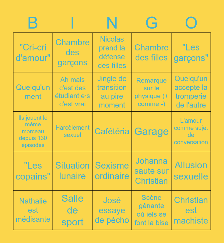 This bingo card has a free space and 24 words: Nathalie est médisante, Situation lunaire, Jingle de transition au pire moment, Scène gênante où iels se font la bise, "Les garçons", "Cri-cri d'amour", Chambre des garçons, Nicolas prend la défense des filles, Garage, L'amour comme sujet de conversation, Ils jouent le même morceau depuis 130 épisodes, Ah mais c'est des étudiant·e·s c'est vrai, Johanna saute sur Christian, Allusion sexuelle, Quelqu'un ment, Salle de sport, José essaye de pécho, Chambre des filles, Quelqu'un accepte la tromperie de l'autre, "Les copains", Harcèlement sexuel, Sexisme ordinaire, Remarque sur le physique (+ comme -) and Christian est machiste.